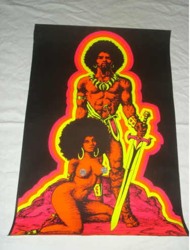 BLACKLIGHT POSTER AFRO MAN & WOMAN JUNGLE BBQ DIM SUM DAGGER BEADS SWORD